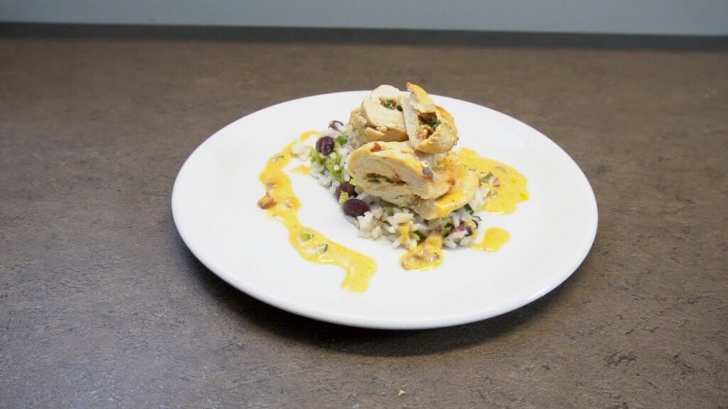 A párolt rizshez keverem a meggőzölt vékony metéltre vágott (julienne) kelkáposztát, és a megfőtt lilababot. Apróra vágott zeller zöld, és újhagyma is kerül bele. Sóval, őrölt borssal, zúzott fokhagymával ízesítem. A tejszínes sajtkrémet apróra vágott szárazkolbásszal és apróra vágott lila, és póré, vagy újhagymával keverem össze. A csirkemellét ezzel a krémmel betöltöm, összehajtom, és megsütöm. A kifolyt töltelékkel és a maradék sülőzsiradékot, a húsnak a szaftját, felöntöm kevés tejszínnel.