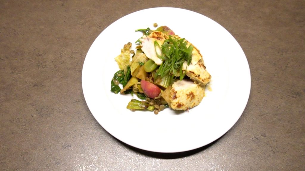 Készítek egy páclevet. A görög joghurthoz keverek néhány csepp citromot, és annak reszelt héját, olíva olajat, őrölt gyömbért, őrölt borsot, sáfrányt és sót. Ebben pácolom a kisebb szeletekre vágott csirkemellet ha lehet, akkor legalább egy éjszakán keresztül. Serpenyőben kevés olajon közepes lángon megsütöm a pácból kiemelt hús darabokat. Egy másik serpenyőben elkészítem az egyszerű ragut. Laskára vágom a megforrázott kelkáposztát. A retket, az angol zellert, a karalábét a lilahagymát, cikkekre vágom, és kevés étolajban megpirítom. Hozzáadom a kelkáposztát, az újhagymát. Sóval, őrölt borssal, fokhagymával ízesítem. Citrom levével csepegtetem, és így adom meg a végső ízét. Végül belekeverem a forrázott lencsét, és friss spenót levelet. Tálaláskor a ragura teszem a megsült húsokat.