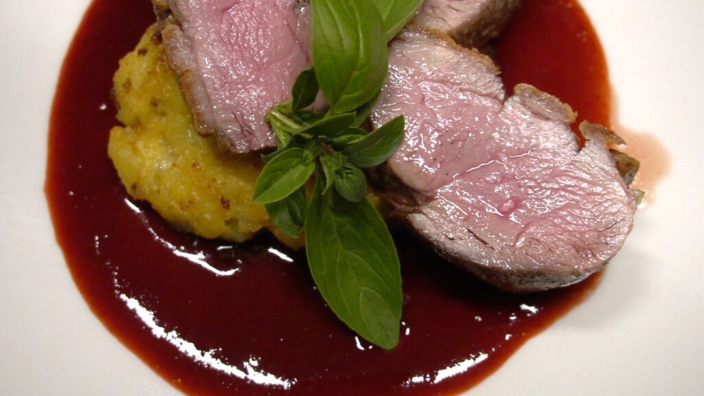 Kacsamelle almás hagymás burgonyával, szilvamártásban