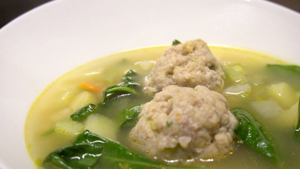 A darált húst, a tojást, az apróra vágott újhagymát, a reszelt sárgarépát és az apróra vágott petrezselyem zöldet a fűszereket összegyúrom, és vizes kézzel 20-30 grammos gombócokká formázom. Sós forró vítzben kifőzöm. Amikor elkészült, kiveszem a gombócokat a vízből. Az ott maradó főzőlével fogom felönteni a levest. A kisebb darabokra vágott sárgarépát, angol zellert, karalábét, újburgonyát az újhagymával együtt kevés napraforgó olajban megpirítom. Óvatosan sózom, frissen őrölt borssal is megszórom. Meghintem kevés liszttel, elkeverem és felöntöm a gombóc levével. Amikor a zöldségek megpuhultak visszateszem a levesbe a gombócot. Összeforralom. Tálaláskor a tányérba friss bébi spenótot teszek, és arra kanalazom rá a forró levest. Utólag igény szerint lehet akár tejföllel, akár tejszínnel dúsítani.